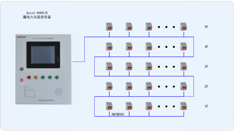 系統(tǒng)組網(wǎng)共分為站控管理層、網(wǎng)絡(luò)通訊層、現(xiàn)場(chǎng)設(shè)備層三層,該項(xiàng)目通訊總線共接入一條通訊總線,總線在樓層配電箱手拉手串接后,接入壁掛式后臺(tái),組成電氣火災(zāi)系統(tǒng)的大動(dòng)脈。箱體中漏電流互感器通過(guò)電流線接入漏電探測(cè)器,漏電探測(cè)器實(shí)時(shí)顯示漏電情況,組成一套信號(hào)穩(wěn)定,精度可靠的電氣火災(zāi)監(jiān)測(cè)系統(tǒng)。