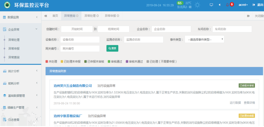 設備狀態分析:統計分企業某個時間段內的產污設備運行、停機,監測設備失聯,可以查看實時上報的數值。